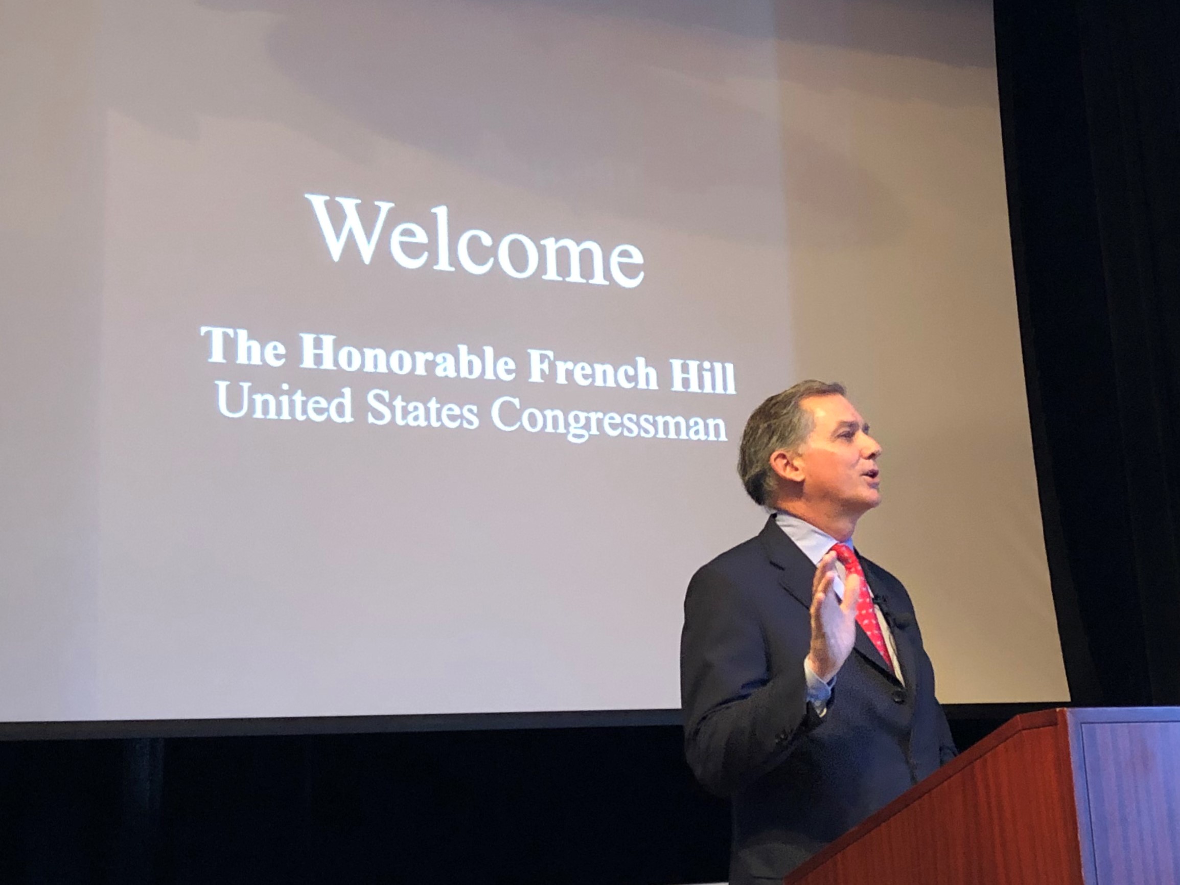 Above: Congressman French Hill addresses faculty, students, and administrators at the Univeristy of Arkansas's J. William Fulbright College of Arts and Sciences.